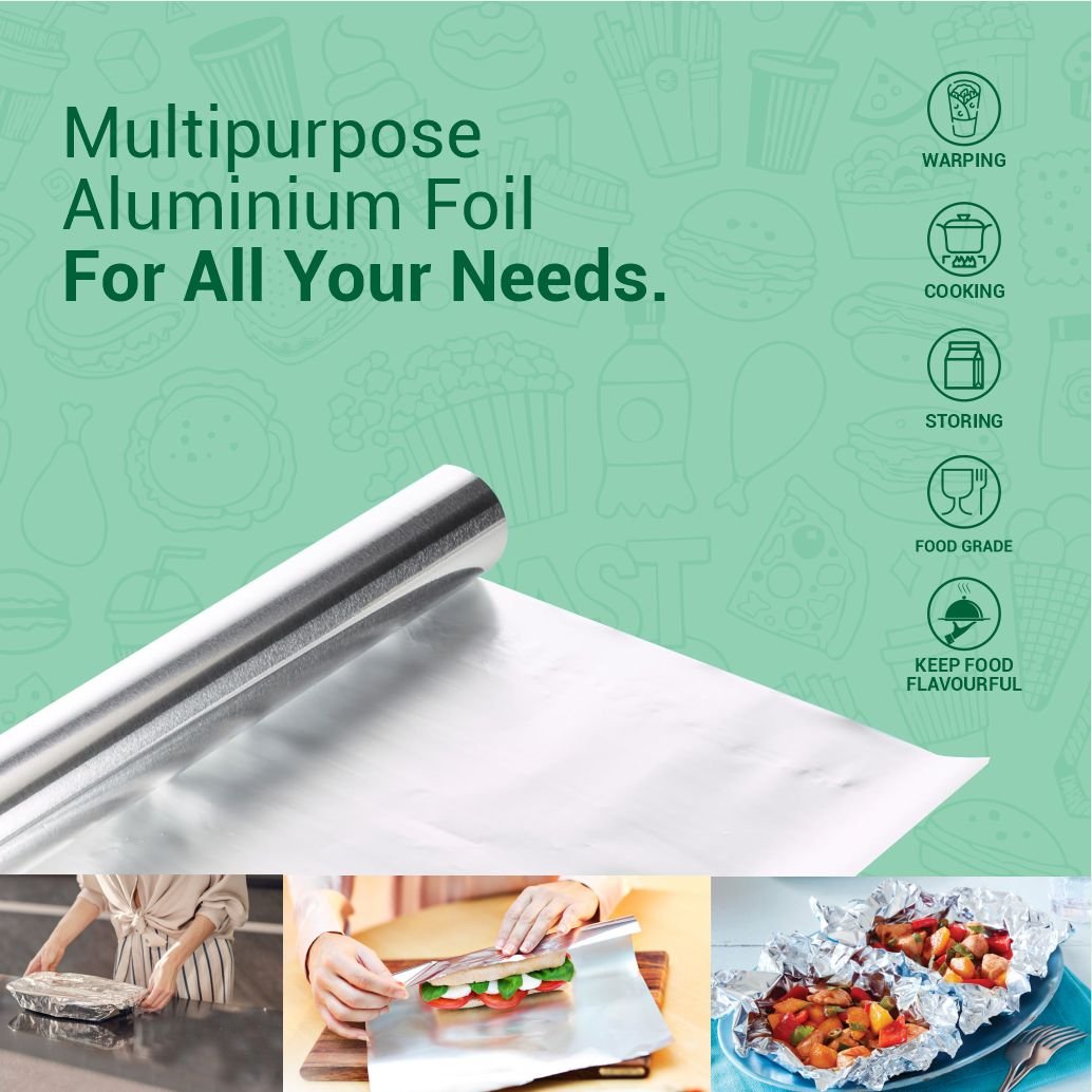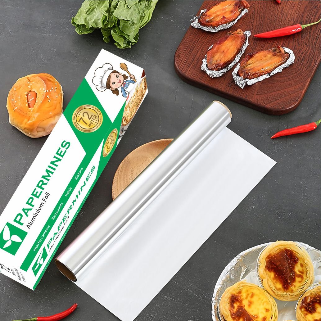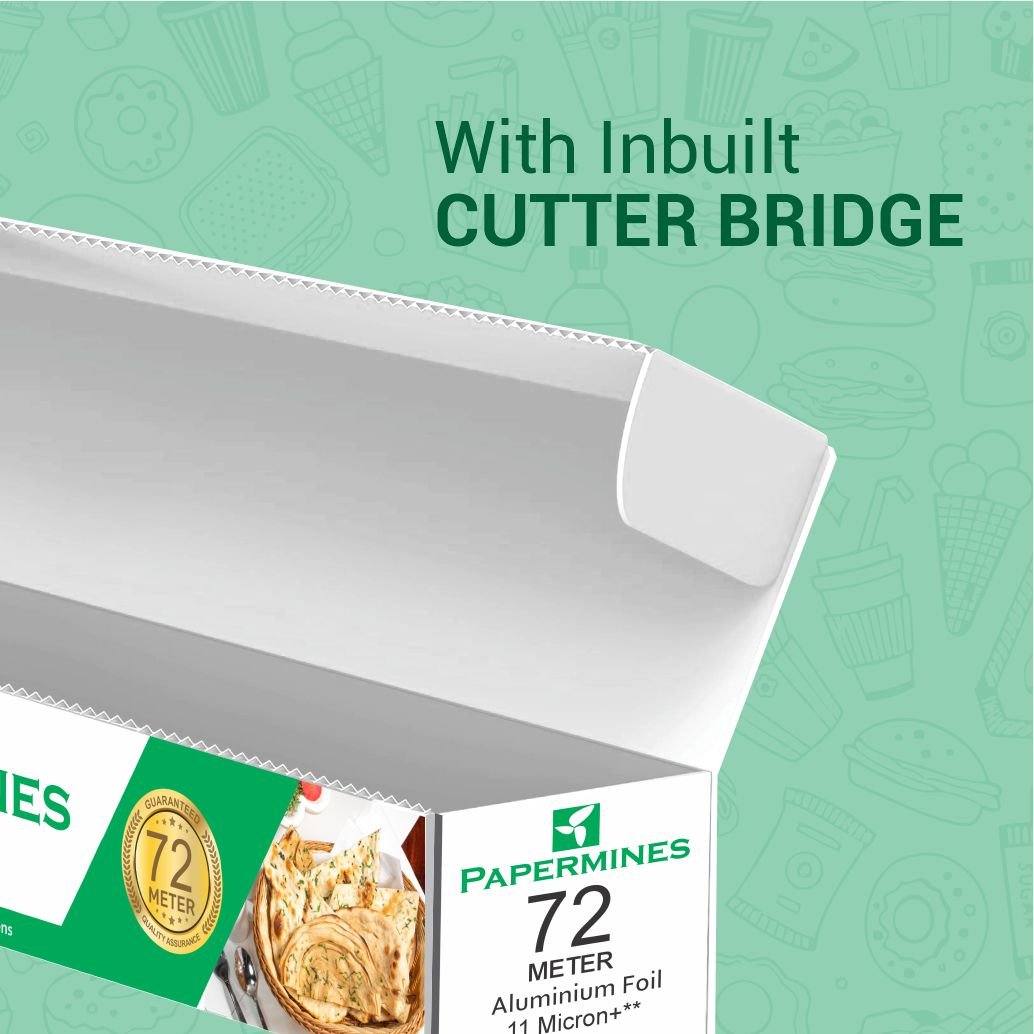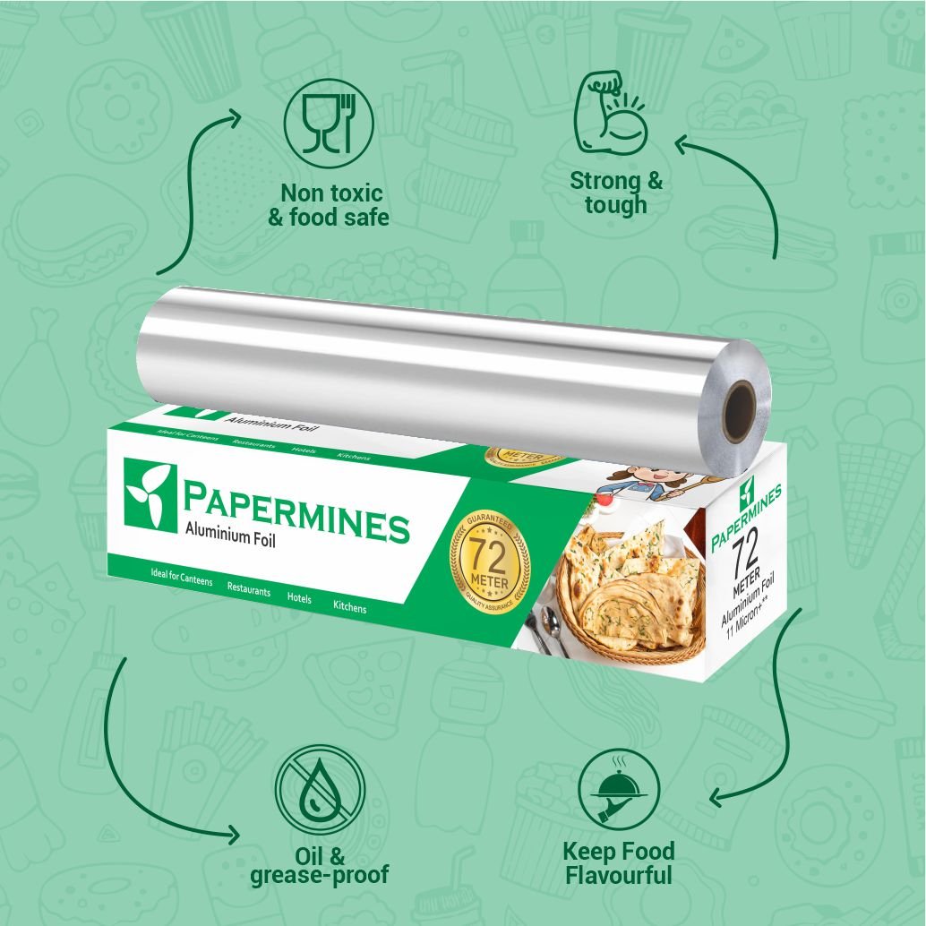 Papermines Aluminium Foil 72 Meter Roll is a food-safe, durable, and multipurpose kitchen foil with 11-micron thickness and a built-in cutter. Whether you're packing, storing, cooking, or wrapping, it keeps food fresh and hygienic. Ideal for both home kitchens and small food businesses.